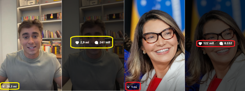 (Do lado esquerdo, Nikolas Ferreira rebate, ponto a ponto, o vídeo de Janja sobre misoginia, alcançando 26,3 milhões de visualizações, 2,9 milhões de curtidas e 241 mil comentários. Já do lado direito, Janja soma 1 milhão de visualizações, 122 mil curtidas e 8.532 comentários em seu vídeo sobre a importância da Lei de Misoginia. Dados coletados em 31/03/2023 às 21h. Fonte: Instagram: @nikolasferreiradm e @janjalula)