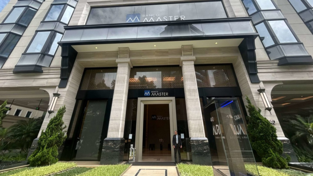 (Fachada do Banco Master em 2025, na Rua Elvira Ferraz, 440, no bairro do Itaim Bibi, em São Paulo. O logotipo da instituição já foi coberto depois da liquidação decretada pelo Banco Central. Foto: Poder360)
