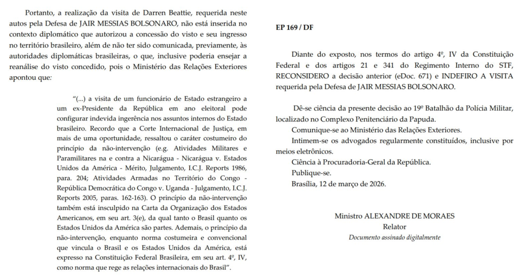 Segundo o despacho, o ministro argumentou que a visita “não está inserida em um contexto diplomático” e que poderia representar interferência externa em assuntos internos do Brasil. Com base nessa interpretação, o pedido foi indeferido.