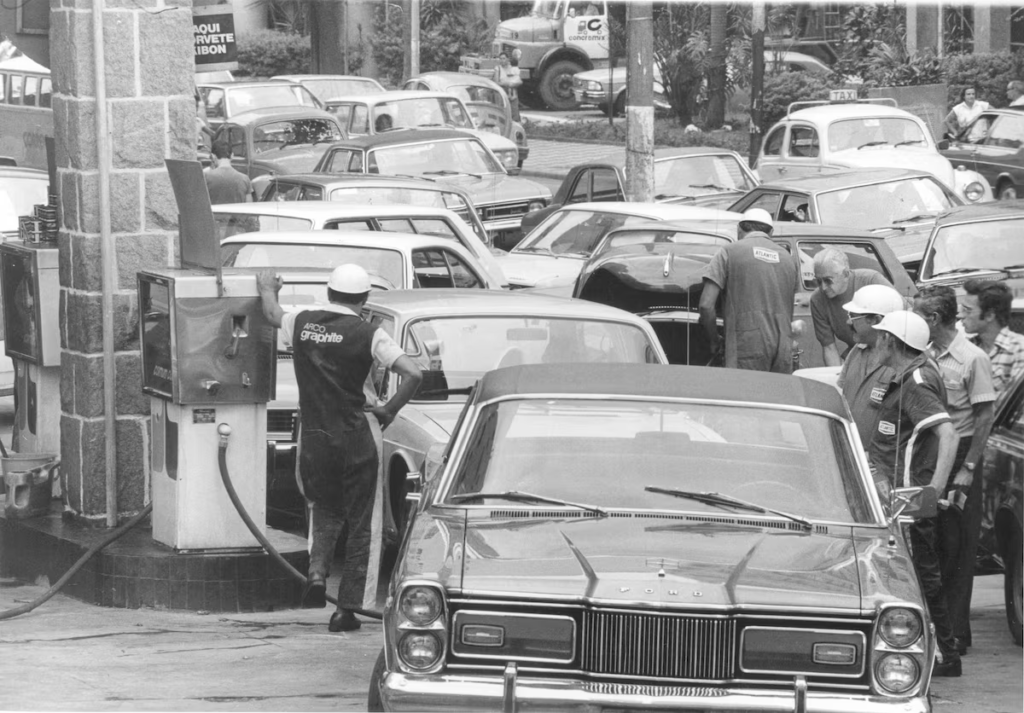 (Fila de carros para abastecer em posto de gasolina na cidade de São Paulo durante a crise mundial do petróleo, que também atingiu o Brasil Foto: Fernando Pimentel/Estadão – 23/11/1979)